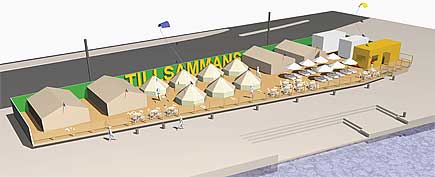 – På Camp Tillsammans kommer vi att ha dygnet runt-bemannad reception som kan hjälpa till med allt från turisttips till tandborstar. Frukosten serveras som room service i en härlig picknickkorg som står utanför tältdörren på morgonen. Campen vid kajkanten kommer att vara helt inhägnad och bara för hotellets gäster. Här bygger Ikea upp såväl en lekplats för barnen som en liten strandklubb med sköna solstolar för de vuxna, säger Claes Anerud, vd på Nobis Hotel.