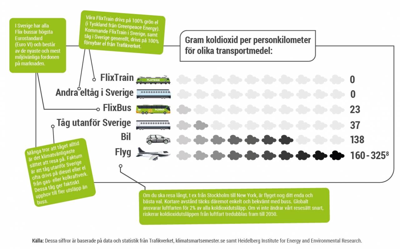 En expressbuss släpper ut ca en tiondel av den mängd koldioxid per personkilometer som går åt för en flygresa, och är dessutom oftast ett mer klimatvänligt alternativ än tåget om man reser ut i Europa.