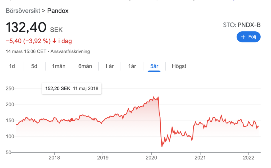 Men ägarna verkar tro på bolaget. När pandemin slog till för två år sedan rasade aktien till 57 kronor, men under pandemin har den segat sig upp med 133 procent till dagens 133 kronor.