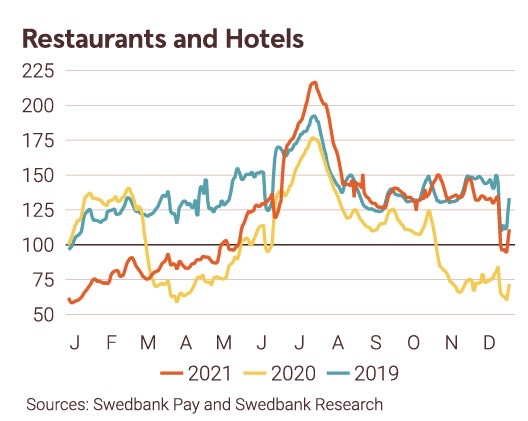 Siffrorna för helåret 2021 visar ändå på ett undantag, under sommaren spenderade vi mer på restauranger och hotell än under motsvarande tid 2019. Delvis fortsatte den utvecklingen under hösten, men bryts av under november med den ökade smittspridningen.