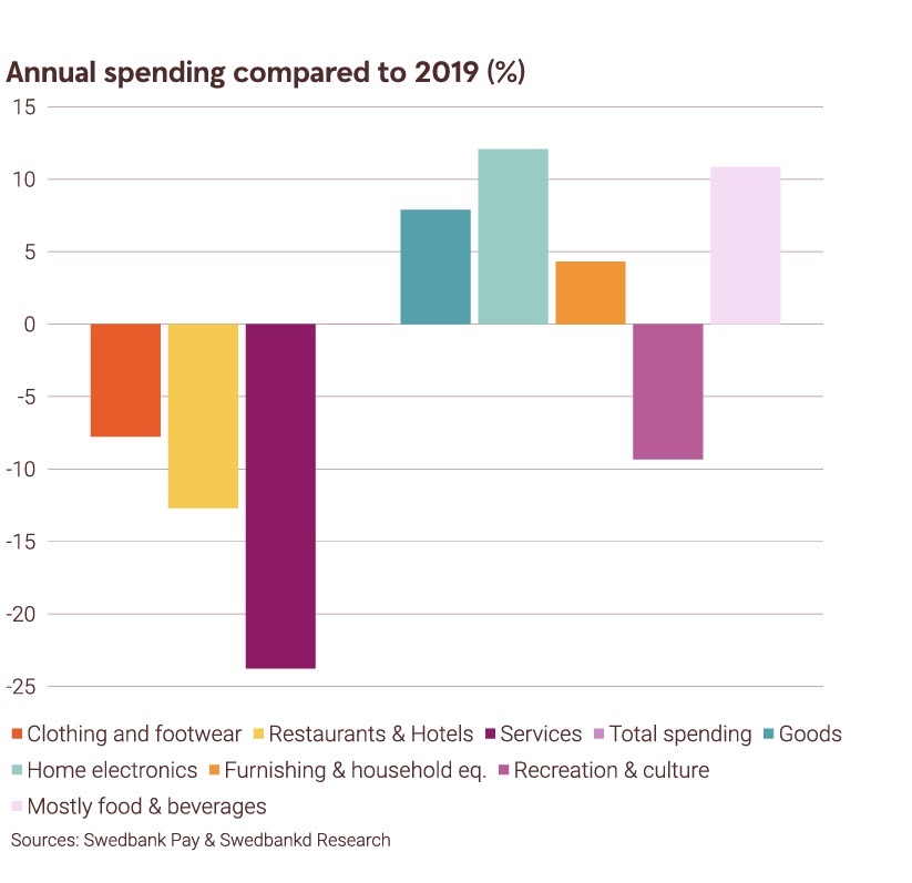 När vi tillbringat mer tid hemma spenderar vi mer på mat och dryck, hemelektronik och annan handel. Betydligt mindre på restauranger och hotell, andra tjänster och kläder och skor.
