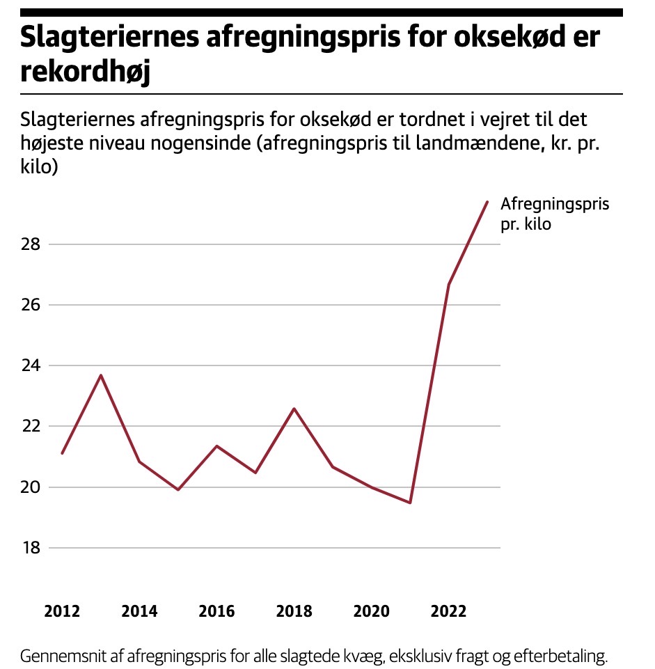 Slakteriernas avräkningspriser på nötkött har stigit till nivåer som är högre än någonsin tidigare, skriver danska tidningen Finans. Efterfrågan har skjutit i höjden på både den danska och europeiska exportmarknaden. Samtidigt minskar produktionen, vilket förstärker prisökningarna.
