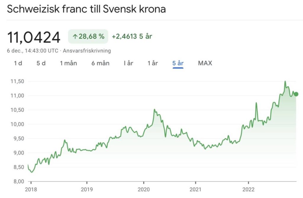 ”Att resa till Schweiz har blivit 30 procent dyrare sedan 2018, och i euroländerna har det blivit strax över tio procent dyrare”