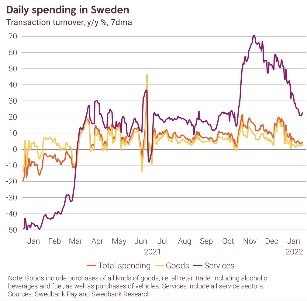 Enbart sett till servicesektorn låg konsumtionen under förra veckan 28 procent lägre än motsvarande vecka 2019. Det visar veckostatistik från Swedbank Macro Research som bygger på de dagliga penningtransaktionerna med kort. Den relativt starka återhämtning som sektorn upplevde under senare delen av hösten bröts av radikalt efter nya restriktioner med omikronsmittan.