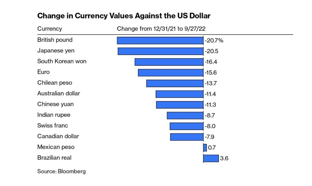 Den urstarka amerikanska dollarn orsakar just nu problem för ekonomier nästan överallt utom i USA. Bedömare menar att den historiska centralbanksdrivna ökningen av dollarn sannolikt inte kommer att avta snart. Den amerikanska valutan är redan starkare än någonsin, vilket överskuggar toppen under den tidiga pandemin.