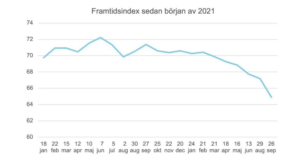 Deras Framtidsindex nådde en topp på 72,2 försommaren 2021, med vaccinationer igång och en stundande semestersäsong. Men i februari–mars i år, i samband med invasionen och Ukraina, startade tilltagande negativ trend. Allra snabbast har det gått senaste månaden – ett fall med 2,3 punkter från 67,2 till 64,9.