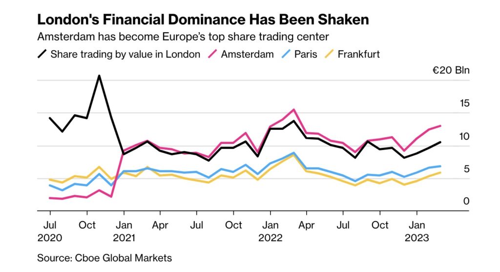 – Farten har varaktigt skiftat från London till kontinentala Europa. Vi observerar en stadig förändring, som inte visar några tecken på att tappa kraften, sa han enligt Bloomberg.