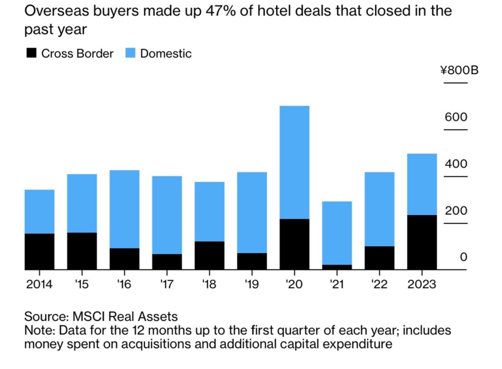 Utländska köpare stod bakom för 47 procent av de 494,3 miljarder yen (3,7 miljarder dollar) som investerats i hotellaffärer under de senaste 12 månaderna, enligt uppgifter i slutet av mars från analysföretaget MSCI Real Assets.