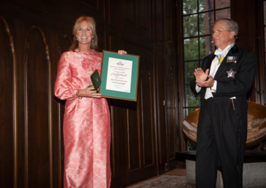 Kungl. Patriotiska Sällskapets ordförande Erik Norberg delar ut medaljen till Anna Barkevall (Böda Sand Beach and Resort, Öland).