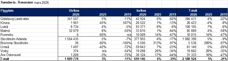 Totalt ökade visserligen flygresandet med drygt 5 procent jämfört med mars 2025, men det är ändå 21 procent färre än före pandemin.