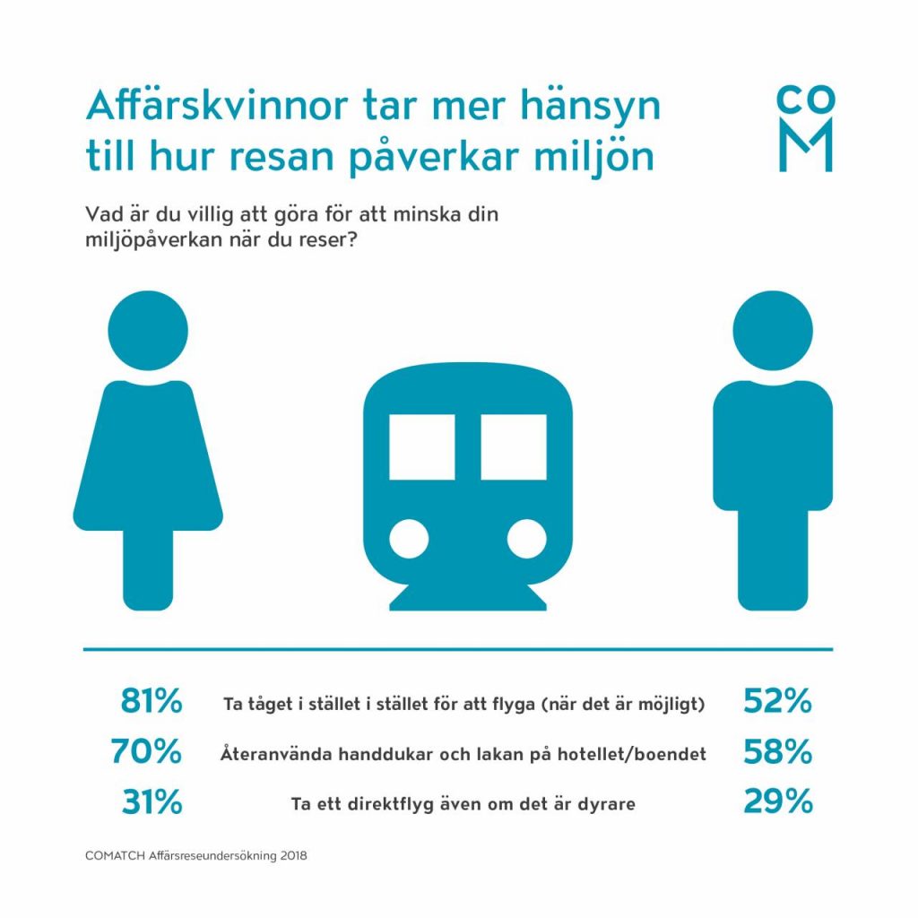 Hänsyn till klimat och miljö står högt på agendan bland dagens affärsresenärer visar en ny undersökning. 71 procent uppger att de oroar sig för resans klimatpåverkan och koldioxidutsläpp. 81 procent av kvinnorna väljer tåg framför flyg som transportmedel på affärsresan om det är möjligt. Siffran för män är 52 procent, enligt ett pressmeddelande.