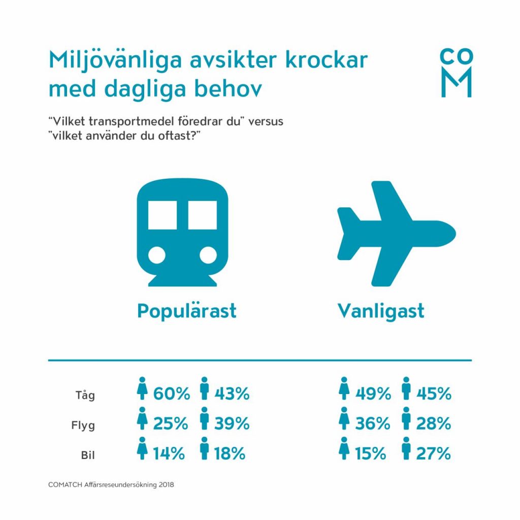 Flyg är det vanligaste transportmedlet men de flesta affärsresenärer föredrar tåg. 60 procent av kvinnorna föredrar tåg som transportmedel jämfört med 43 procent av männen. 25 procent av kvinnorna föredrar att flyga, bland männen är siffran 39 procent. Intressant är också att kvinnor anser att de flyger dubbelt så mycket som de egentligen skulle vilja. Och de tar tåget hälften så ofta som de skulle vilja. 81 procent av de kvinnliga respondenterna anger att de väljer tåg framför flyg så ofta det är möjligt. Bland männen är andelen 52 procent.
