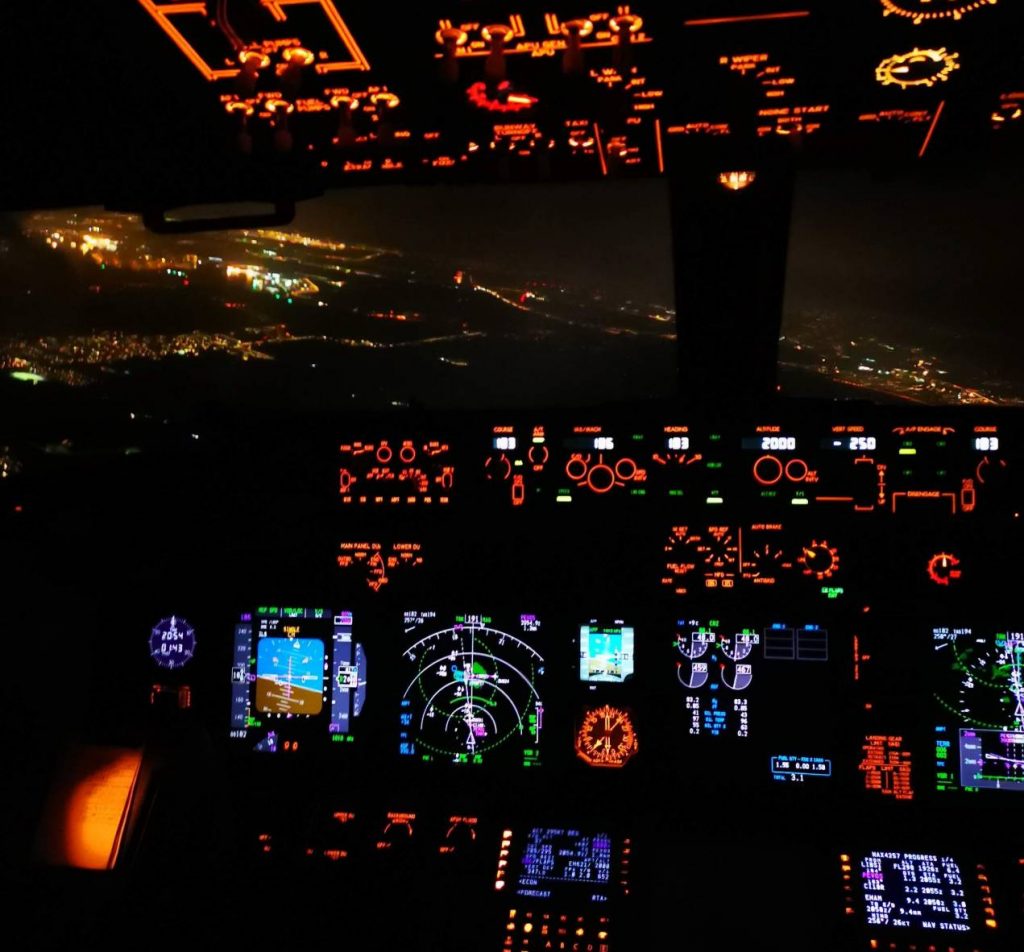 DENNA FLYGNING ÄR ett möte med två piloter och en humanist. Men vi förenas i en känsla när Amsterdam börjar synas i fjärran. Framför oss på himlen ser vi en lampa glimma. På radarn ser vi att det är ett flygplan som ska landa på samma bana som oss. Vi kommer från öster och de från väster. Wifi-lampan i taket släcks och vi börjar vår inflygning. Målet är att glidflyga ner. Pricken framför oss viker av mot vänster och strax efteråt börjar vi en mjuk sväng åt samma håll. En röst i våra lurar räknar ner höjden. I händelse av att piloterna inte kan se landningsbanan ska vi lyfta och flyga upp i himlen igen. Men det är ingen risk att detta händer för sikten är perfekt och lamporna där nere lyser exakt som de ska. Vi landar mjukt och kör sedan fort till vår gate. Denna resa i cockpit var faktiskt ännu häftigare än jag hade trott att den skulle vara. Och enligt kapten Johan får han samma kick varje gång. Värt att tillägga: Vi flög in tio minuters försening och sparade 300 kg bränsle.