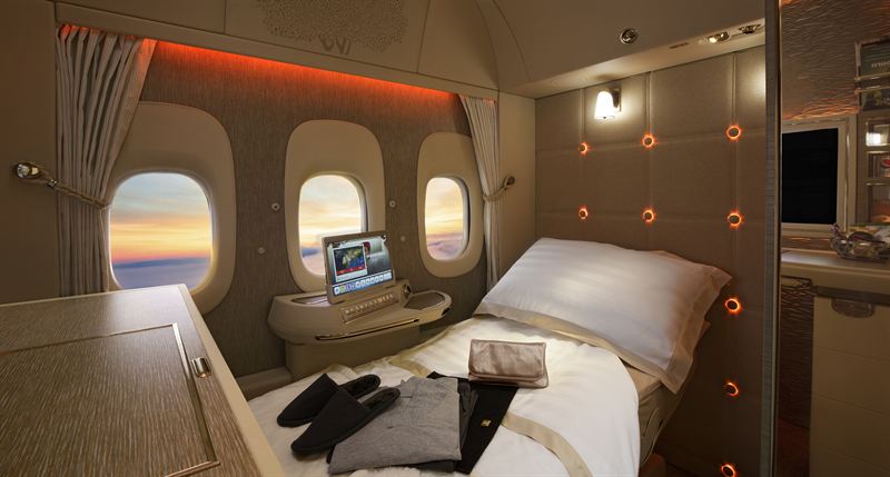 Första klass-sviterna har tagits fram i samarbete med Boeing, Rockwell Collins interior systems, Panasonic, Jacques Pierre Jean Design studio och Seattle-baserade designbyrån Teague. De mjuka lädersätena kan omvandlas till fullt nedfällbara sängar och kan försättas i så kallat ”Zero-gravity”-läge, inspirerad från NASA-teknik, som ger resenären högre komfort och skapar en känsla av viktlöshet, enligt ett pressmeddelande.