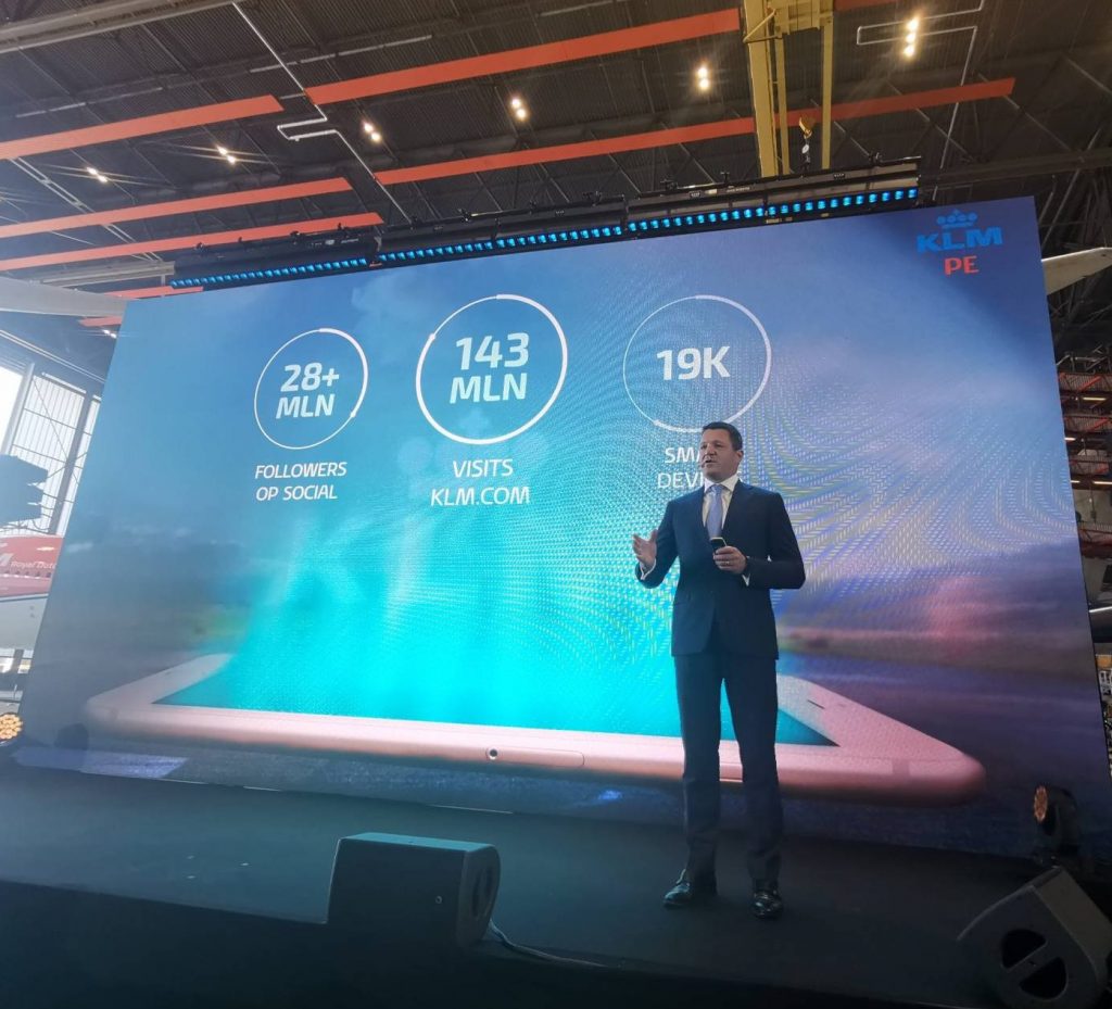Här berättar KLM:s vd Pieter Elbers om bolaget i sociala medier på ett arrangemang i samband med att man fyller 100 år.