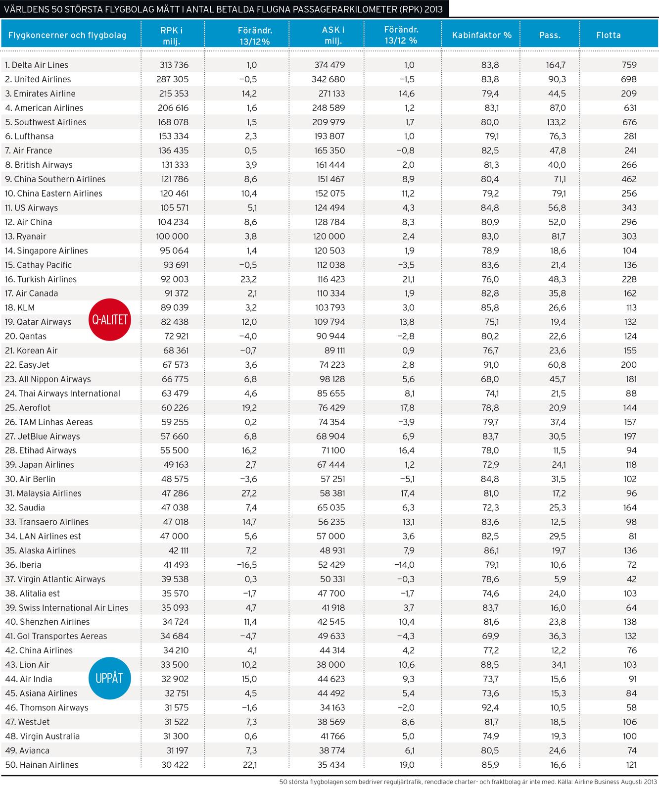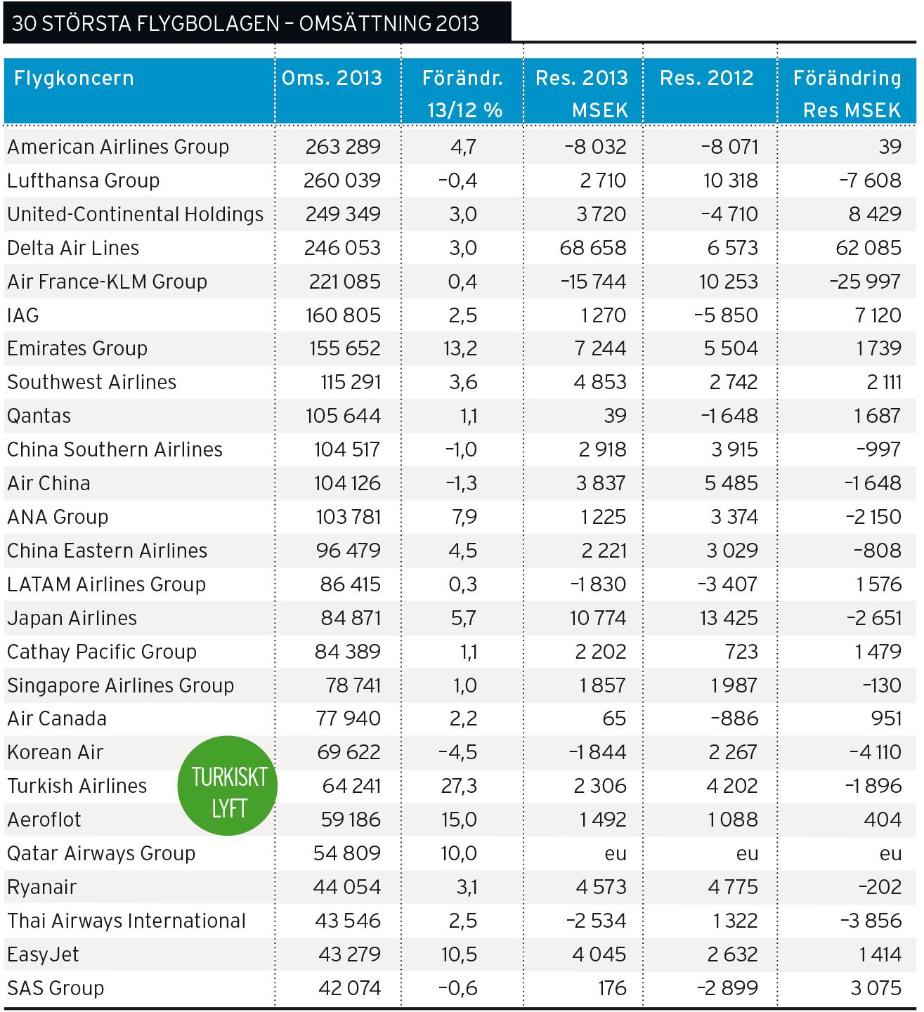 Världslistan är hämtad ur den ­brittiska flygtidskriften Airline Business (augusti 2014), som årligen ställer ­samman ­statistik över den internationella ­flygmarknaden. Vissa bolag redovisar i amerikanska dollar. För dem som redovisar i lokal valuta har Airline Business först räknat om till dollar. TN har sedan omvandlat till svenska kronor.