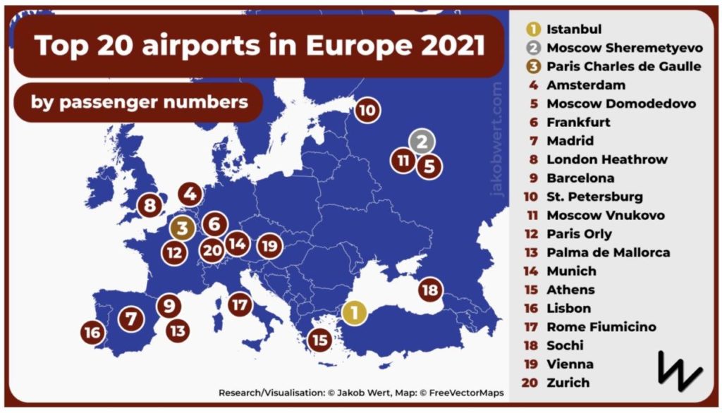 Reserestriktionerna har omvandlat den europeiska flygkartan. Enkelt uttryckt har tyngdpunkten förflyttats österut i Europa. Istanbuls flygplats är 2021 den mest trafikerade, och tre ryska flygplatser finns på tio-i-topp, och har fem bland de 20 främsta. Det visar en sammanställning gjord av aeroTelegrah i samarbete med Simple Flying.