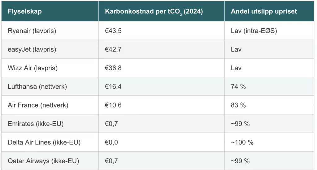 Data visar att europeiska lågprisbolag betalar mångdubbelt mer per ton CO₂ än globala konkurrenter. Samtidigt är en stor del av utsläppen från långdistansflyg – särskilt från icke-europeiska bolag – i praktiken oreglerade.