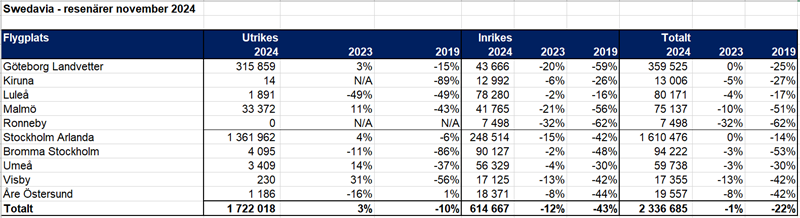 Under november reste drygt 2,3 miljoner resenärer via Swedavias tio flygplatser. Utrikesresandet ökade med tre procent till drygt 1,7 miljoner resenärer och inrikesresandet minskade med 12 procent till drygt 614 000 resenärer. Flygresandet i november ligger totalt sett en procent lägre jämfört med november 2023. Det totala resandet via Swedavias flygplatser i november ligger på 78 procent av prepandeminivåerna, 2019.