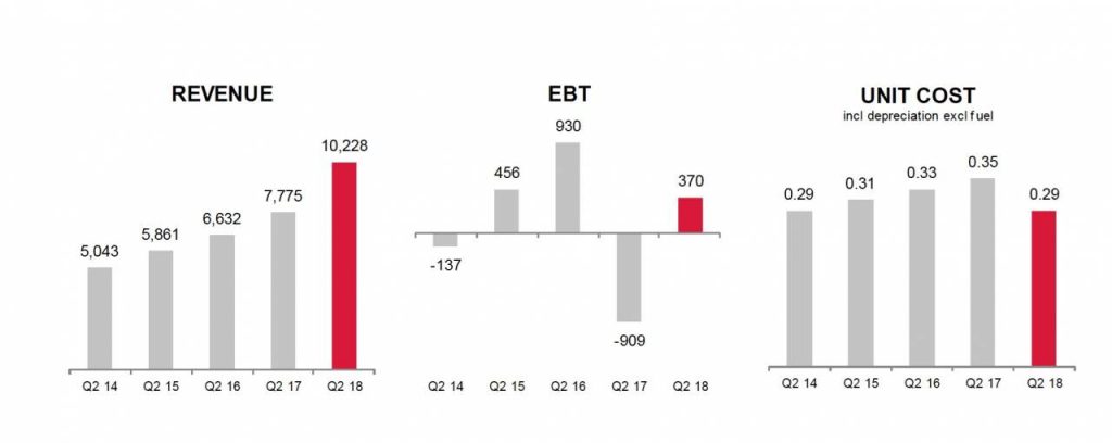 Nettoresultatet var 300 miljoner NOK, en kraftig förbättring jämfört med föregående år då underskottet var på 691 MNOK. Under andra kvartalet minskade bolagets kostnader med nio procent,19 procent exklusive bränslekostnader. Engångseffekter har bidragit till kostnadsminskningar även under andra kvartalet. Kostnaderna har minskat trots att bolaget har haft den högsta tillväxten någonsin under ett kvartal med 48 procent (ASK) och trots att oljepriset har varit betydligt högre jämfört med samma period föregående år. Trafiktillväxten under andra kvartalet var på 46 procent, enligt pressmeddelande.