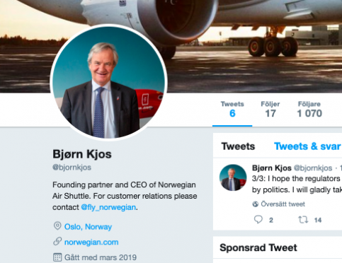 Flyg Norwegians vd Bjørn Kjos började med Twitter den första april. Han skriver bland annat om…