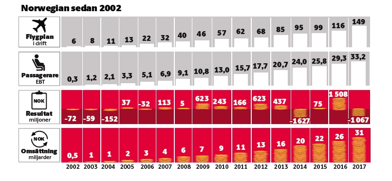 Men några pengar har Norwegian knappt tjänat under resan från regionalflyg på norska kusten till resmål i fyra kontinenter. Det samlade resultatet före skatt för hela 2000-talet är bara 827 miljoner norska kronor, 50 miljoner i snitt per år. Det är inte ens kaffepengar i en bransch där kostnaderna kan skjuta i skyn med stridigheterna i Mellanöstern,