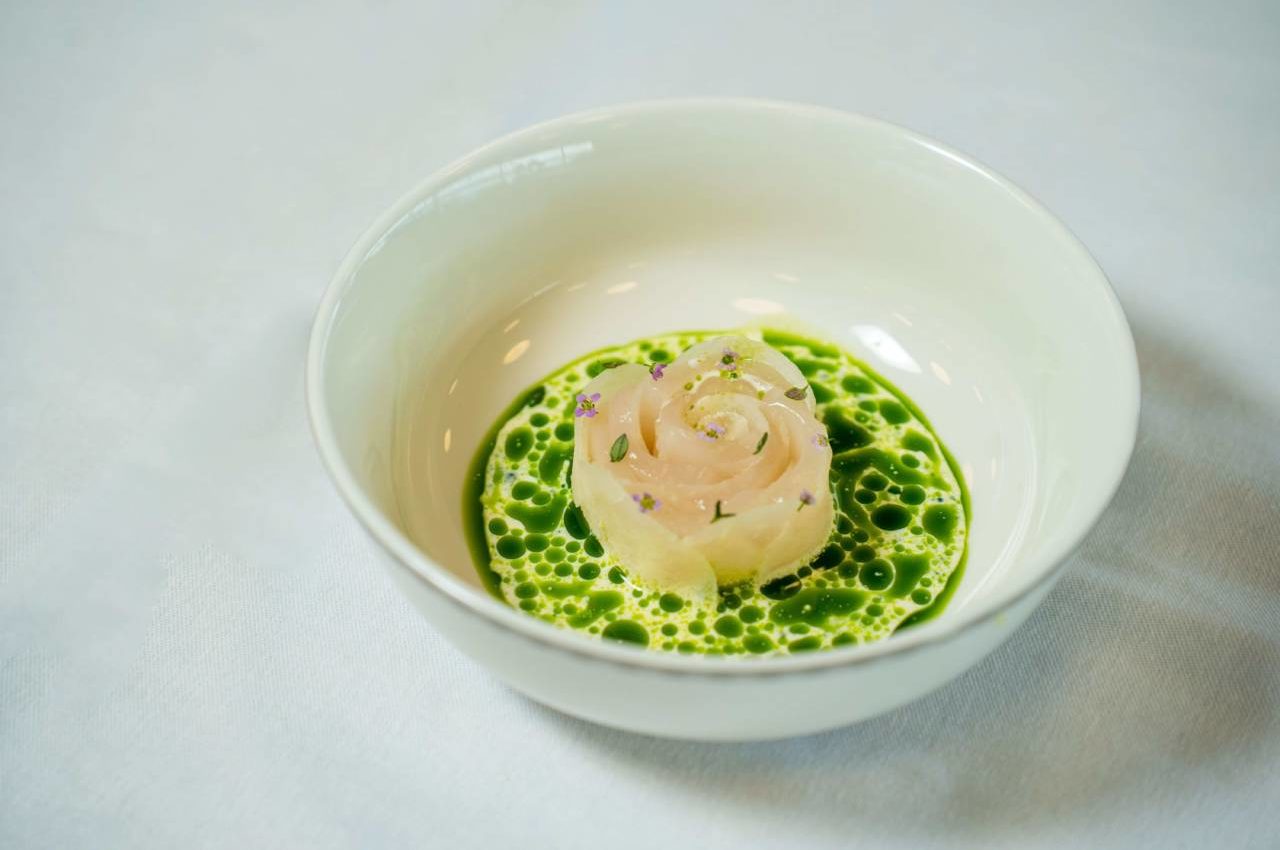 Denna meny, skapad av köksmästare Søren Selin, inkluderar rätter som pilgrimsmussla med glaskål, pepparrot och dill samt lammculotte med hjärtsallad, murkelsås och vårörter.