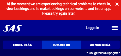 – Det rör sig om tekniska problem hos vår systemleverantör. Problemet har varit ungefär en timme efter lunch. Felet ska vara åtgärdat så vi hoppas att vi snart ska återgå till det normala, säger Freja Annamatz på SAS till Travel News.