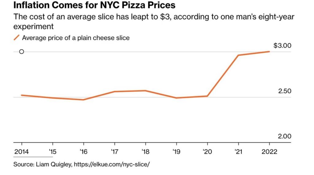 Från 2014 till 2022 fann han att det genomsnittliga priset på en vanlig pizzaslice steg från 2,52 dollar till 3 dollar. Pepperonipizzaslice, som alltid har varit lite dyrare, kostar nu i genomsnitt 4,58 dollar, enligt Quigleys beräkning.