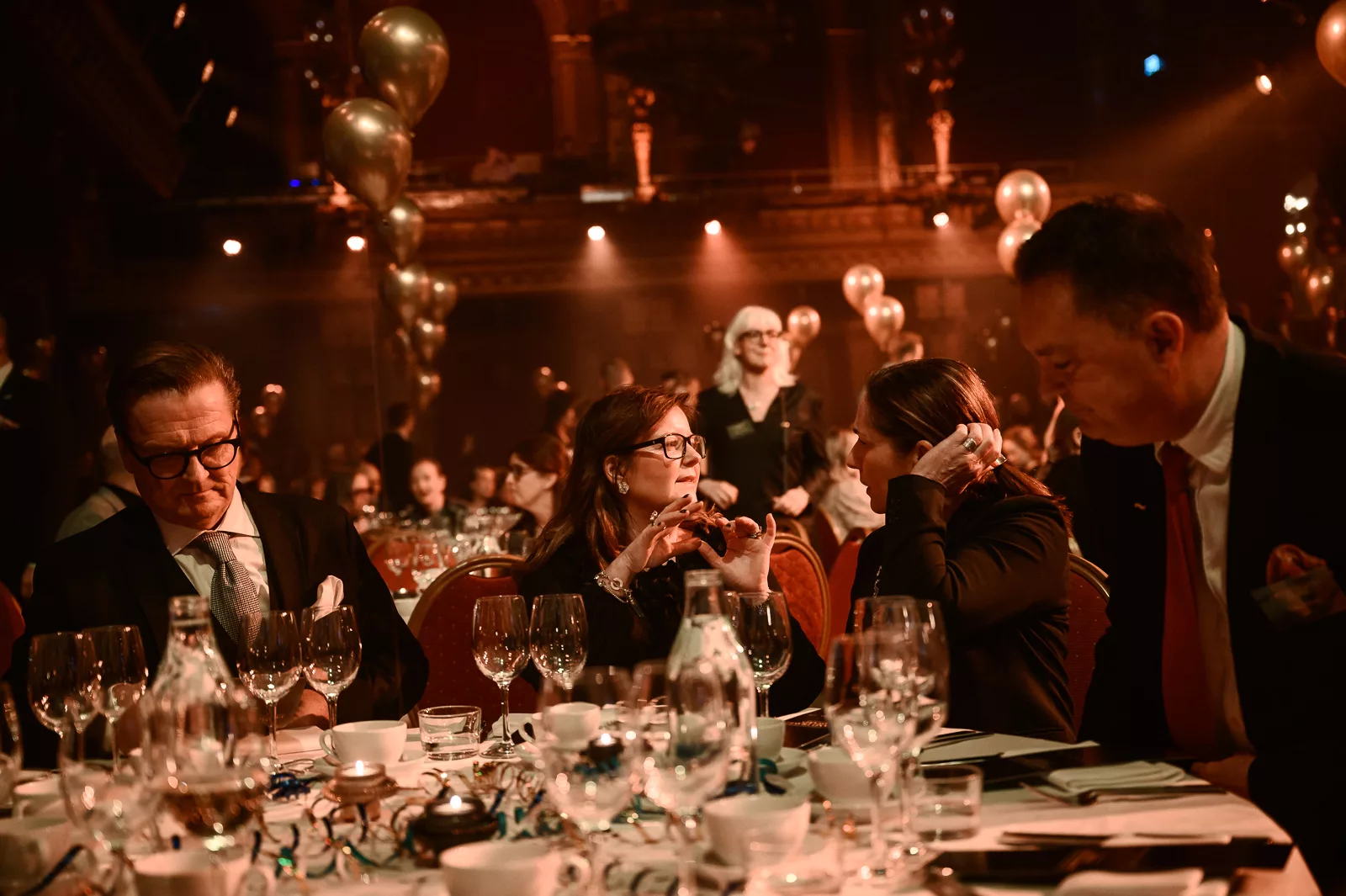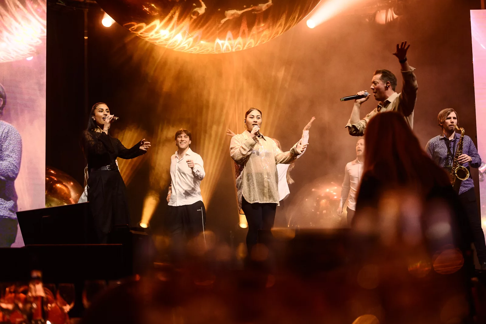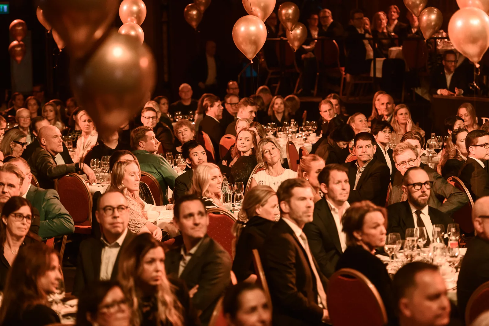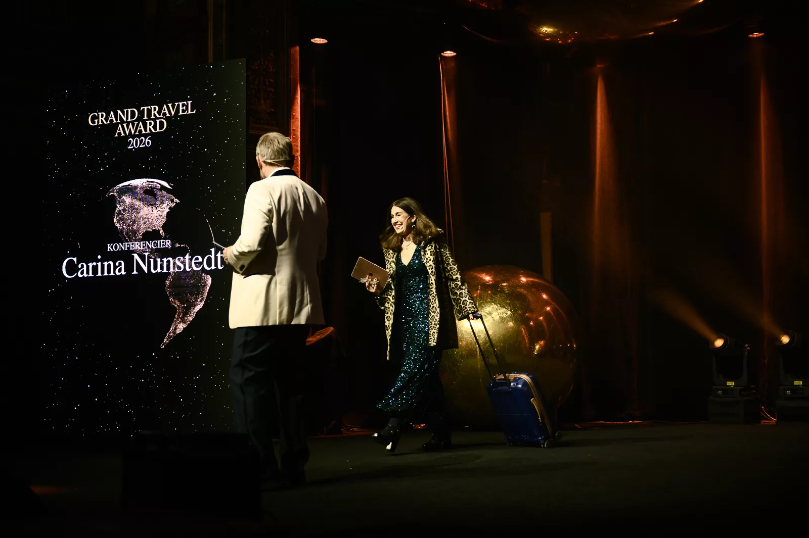 Kvällens konferencier, Carina Nunstedt, äntrar scenen.