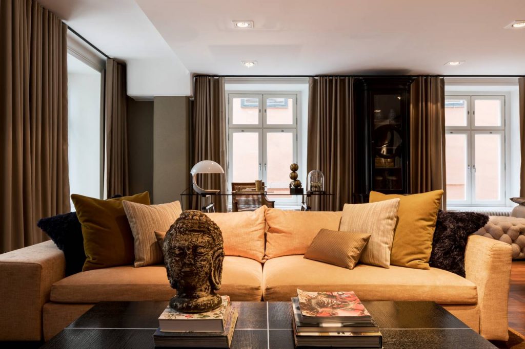 Inredningen är eklektisk med moderna och tidlösa möbler, textilier i varma toner och olika material och mycket layiering – toppat med konst på väggarna med dokumentära motiv. Med de 46 individuellt designade rummen och de 4 allmänna vardagsrummen har de lyckats skapa en lyxig men personlig atmosfär.
