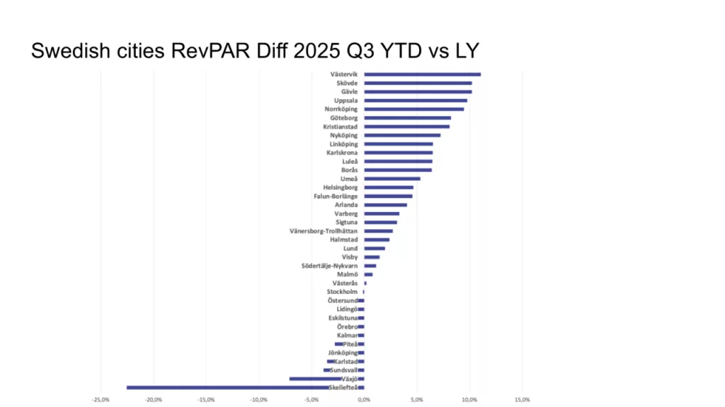 I Stockholm, Västerås och Östersund har RevPAR i stort set legat still. Och i Gävle. Skövde och Västervik har priserna ökat med drygt 10 procent.