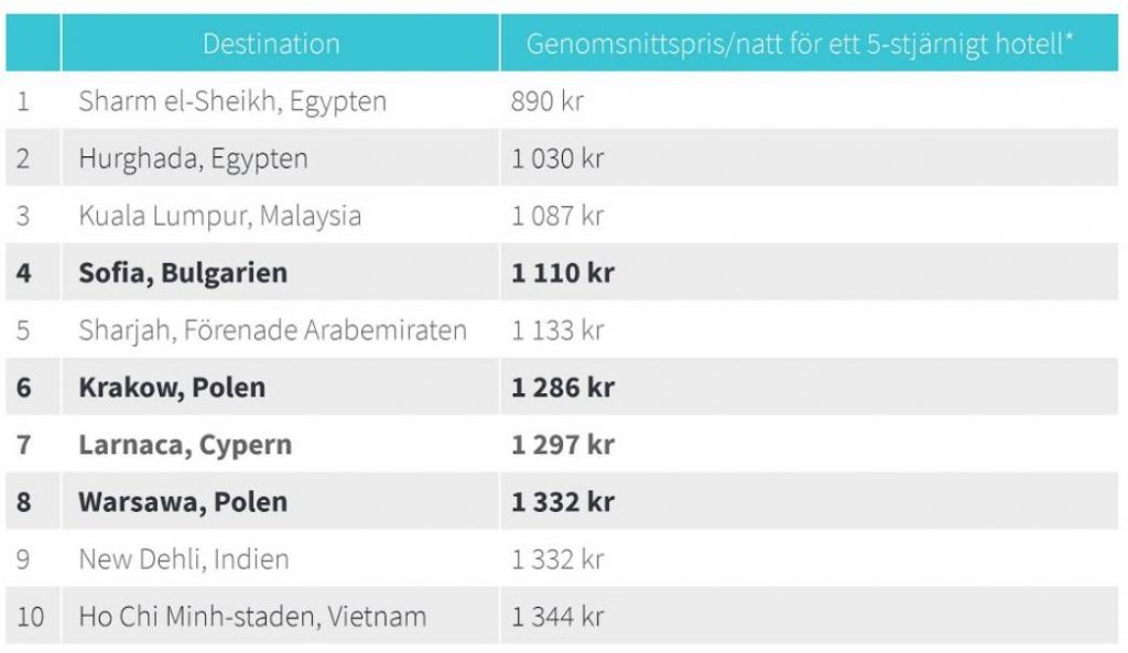 På andra plats återfinns ytterligare en av Egyptens mest populära turistorter, Hurghada. Här ligger snittpriset på ett 5-stjärnigt hotell på 1030 kr. Korallrev, vattensport och El Dahar, är några av Hurghadas kännetecken. På plats tre till fem på listan kommer Kuala Lumpur (Malaysia), Sofia (Bulgarien) och Sharjah (Förenade Arabemiraten). Sharjah är ett hett tips för dem som vill uppleva Dubai men vill hålla nere hotellutgifterna. Sharjah ligger i grannemiratet, bara c:a 30 min-1 timmes bilfärd bort, beroende på trafik.