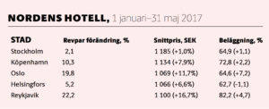 När årets fem första hotellmånader ska summeras för Norden huvudstäder tappar Stockholm fart jämfört med flera av grannarna. Revpar (genomsnittlig intäkt per tillgängligt rum) har visserligen ökat med 2,1 procent jämfört med motsvarande period i fjol, men det ska jämföras med exempelvis +10,3 procent i Köpenhamn och +19,8 i Oslo.