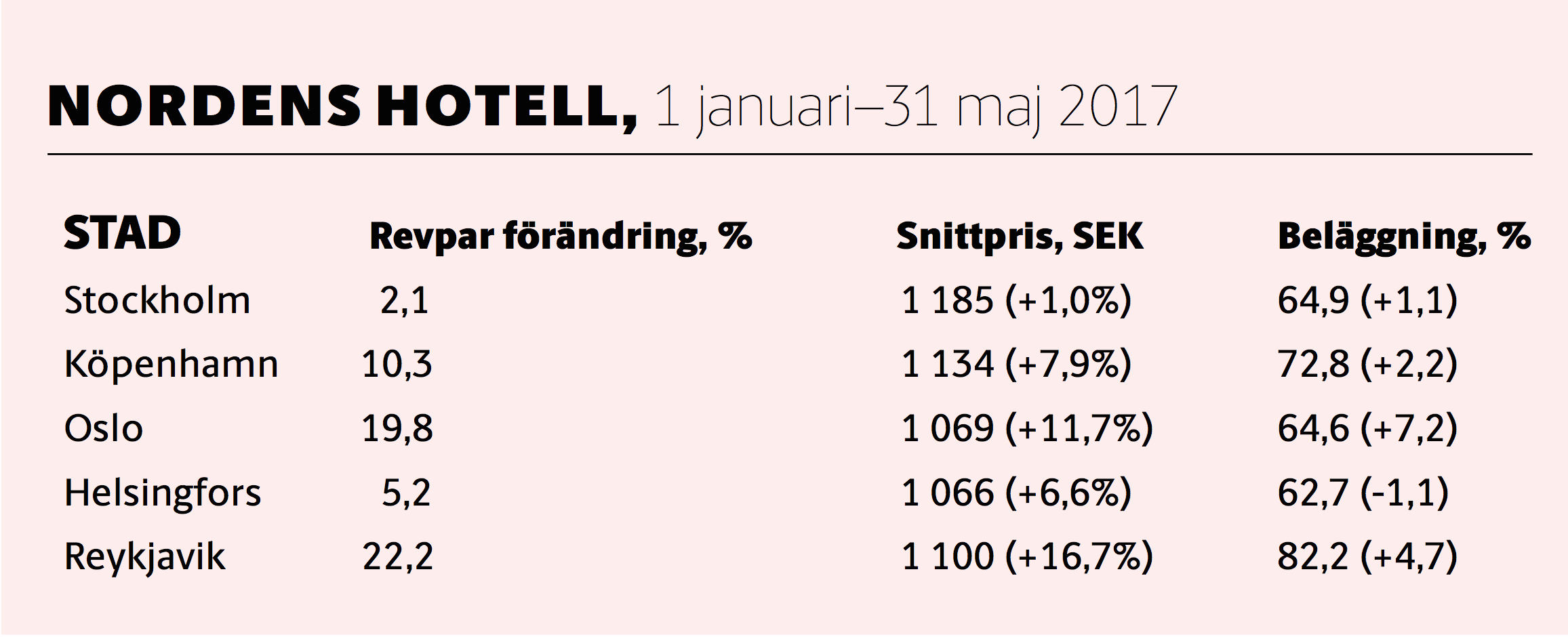 Samtidigt har beläggningen ”bara” ökat med 1,1 procentenheter till 64,9 procent i den svenska huvudstaden, medan ökningen i den danska huvudstaden ligger på 2,2 procentenheter och i Norges dito på 7,2 procentenheter.