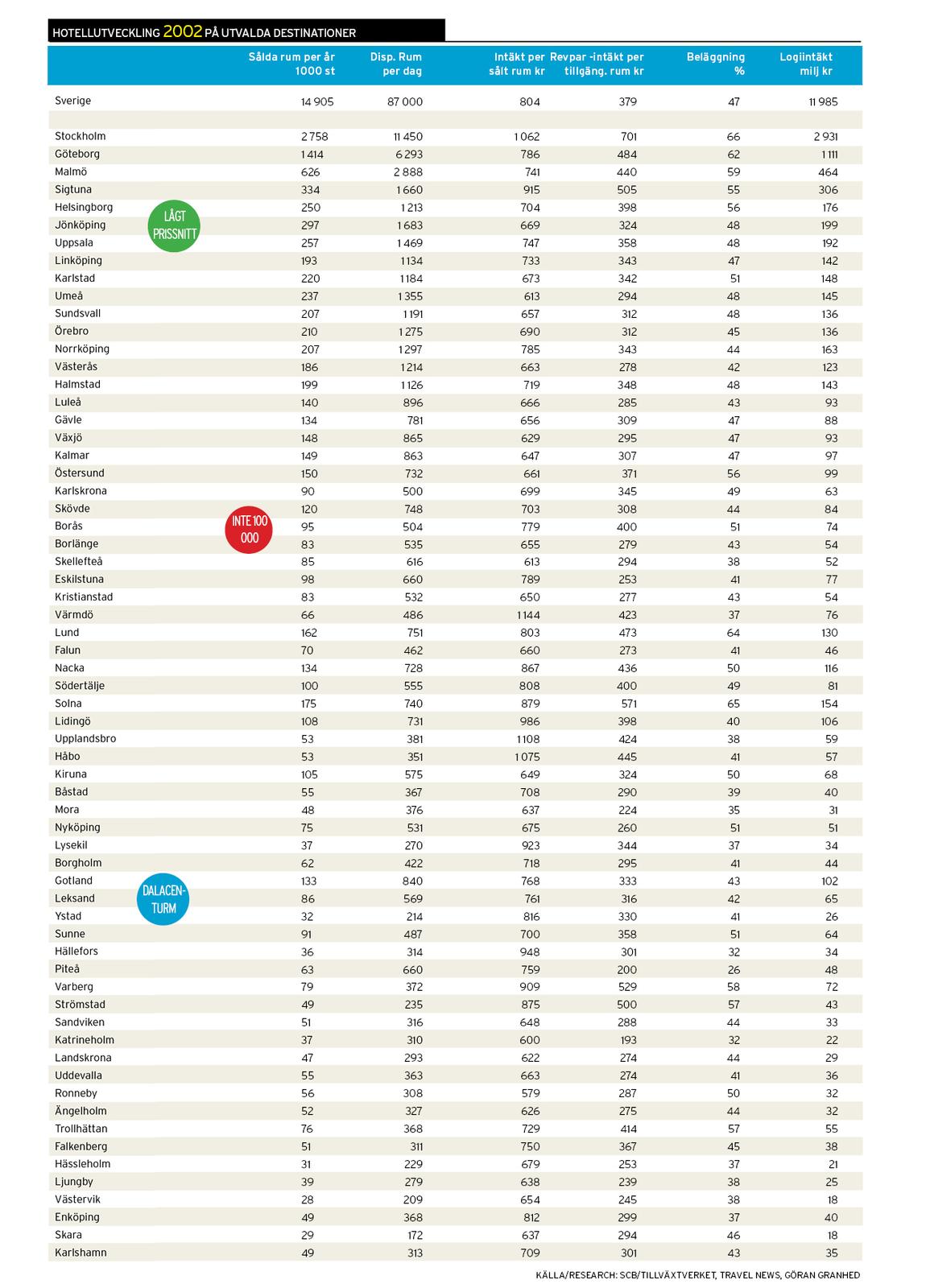 Förlorare, som tappat hotellgäster under perioden, är Ronneby, Sunne, Upplands-bro, Håbo, Leksand och Hällefors. I vissa fall har hotellen lyckats anpassa sig kortsiktigt till en vikande marknad, i andra fall ger det djupare avtryck i resultaträkningen. Sunne är den destination där kundunderlaget vikit mest, 31 procent under tioårsperioden. Utvecklingen speglar det faktum att det blivit tuffare för konferensanläggningar ute i landet att klara sig.