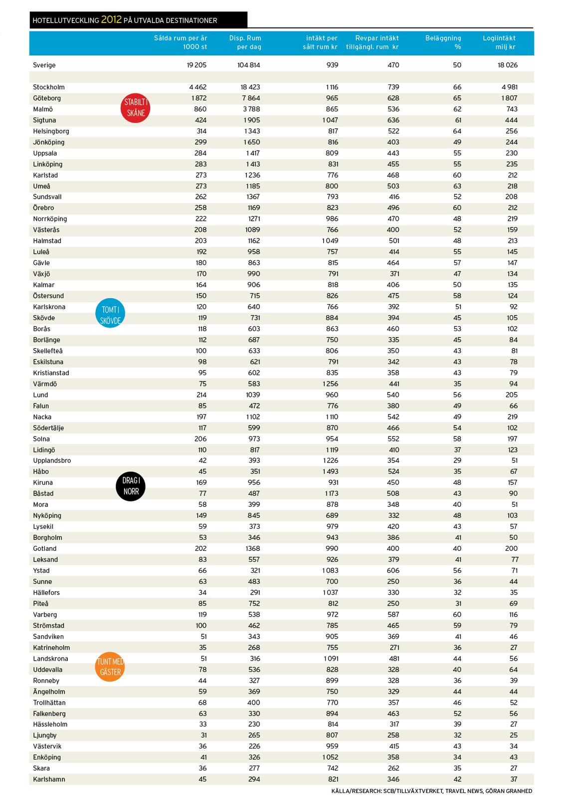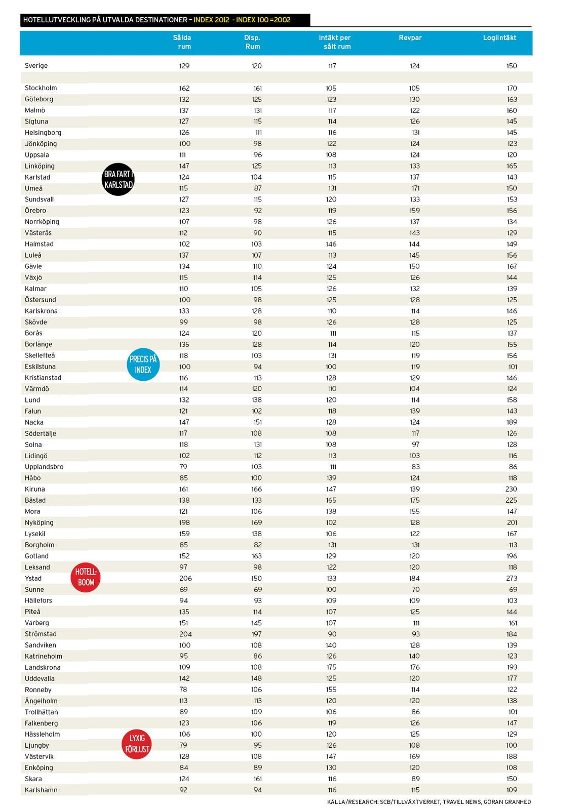 I snitt har Sveriges hotell ökat antalet sålda rum med 2,9 procent per år. Från 2002 till 2012 steg hotellbranschens omsättning från 20 till 33 miljarder (inklusive restaurangverksamheten) och beläggningen från 47 till 50 procent. Revpar, intäkten per tillgängligt rum, gick upp med 24 procent i snitt och drevs i högre grad av efterfrågan än av prisökningar.