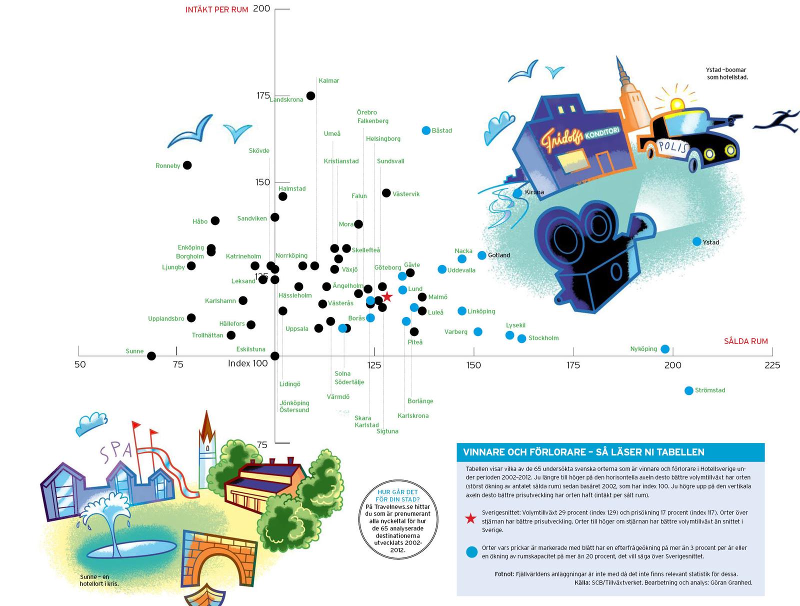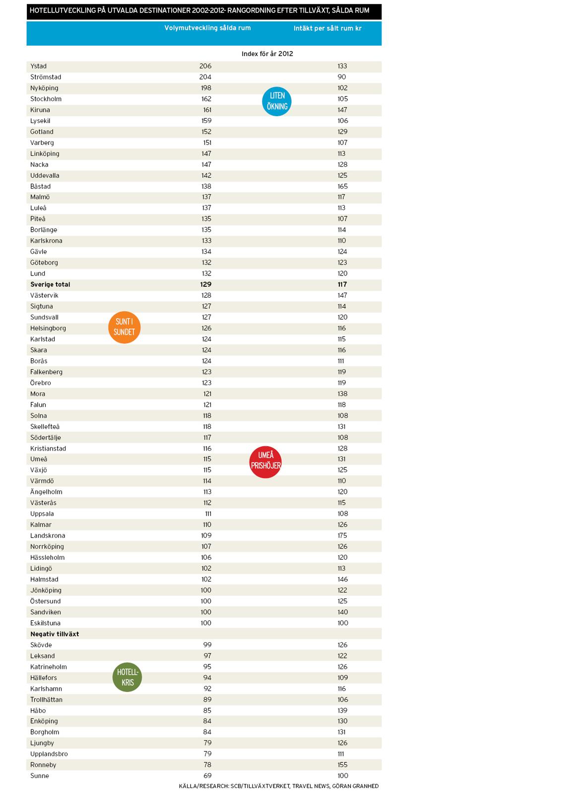 Den unika statistik som Travel News tagit fram för 65 destinationer, som jämför 2012 med 2002, baserat på hotellstatistik från SCB/Tillväxtverket, visar att Ystad tillsammans med Strömstad och Nyköping har lyckats fördubbla efterfrågan på hotellrum. Ystad har bäst av dessa lyckats slå mynt av turistanstormningen. Prisnivån på hotellrum, intäkten per sålt rum, har ökat med 33 procent. Att kapacitetsökningen varit mindre än tillväxten har bidragit till de höjda priserna.