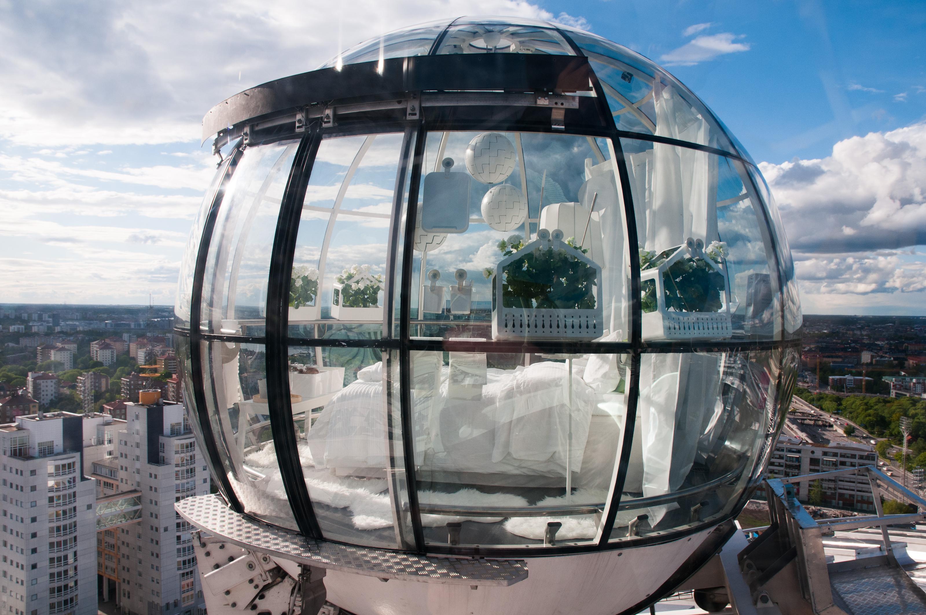 Hotell Den 29 juni förvandlas gondolen Skyview på toppen av Globen till ett sovrum.