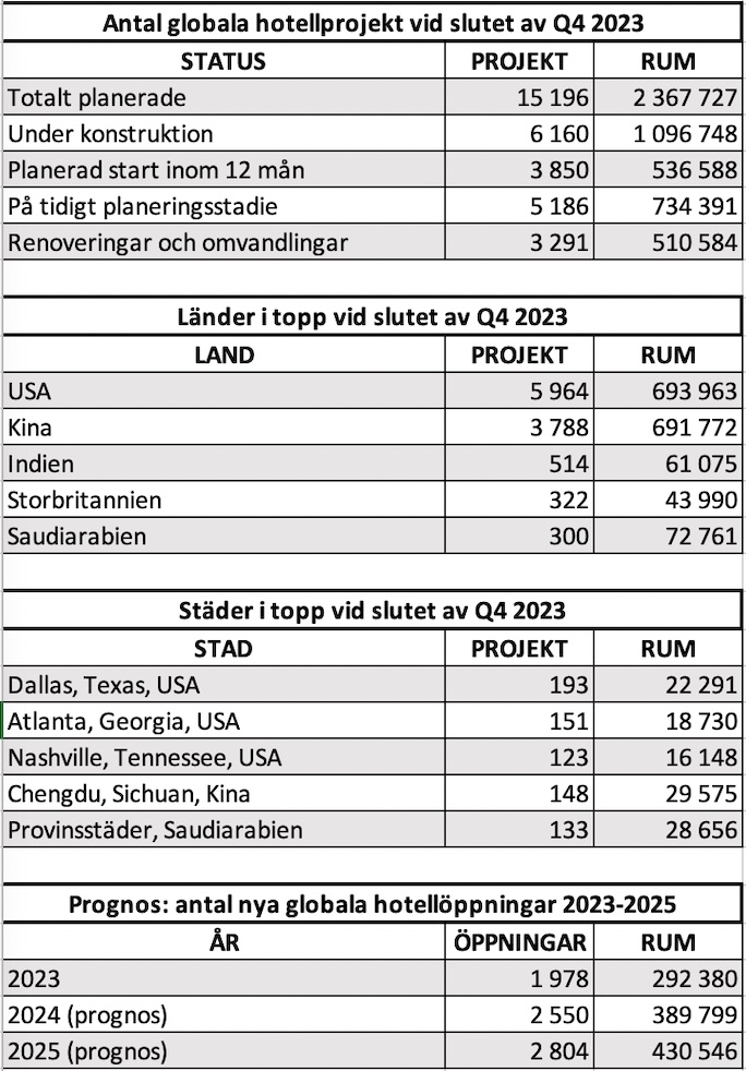 Flest nya projekt pågår i USA, Kina och Indien; samtliga tre städer med flest nya planerade hotell finns i USA. Men även Storbritannien hittas i toppen. Liksom Saudiarabien som är mitt uppe i en gigantisk push för att börja locka internationella turister.