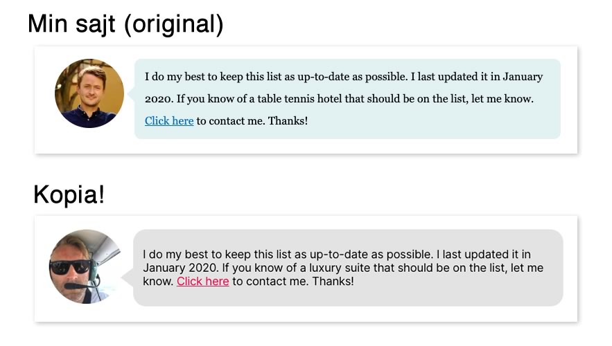Externa, bilderna, koden, ja allt. Till och med länkarna leder fortfarande till en av mina sajter. Själva personen som laddat ner hela min sajt och lagt upp den på en egen domän verkar vara ingen mindre än Hotelspecials svenske VD, Fredrik Jansson. Tyvärr tycker jag att klonen är lite taffligt gjord. Det är ganska små utseendeändringar som gjorts – men alla ändringar som gjorts har gjort sajten… ganska mycket fulare. Om man ska kopiera får man väl ändå göra det med lite stil, tycker jag! Vad tycker ni?