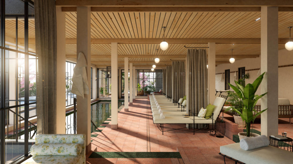 Det är troligen i underkant för när vi går runt och tittar i bygget så är Caroline och Madeleine mycket engagerade i alla detaljer. Det är grönt handgjort kakel från Italien i ångbastun. Badrummens kakel kommer från Amalfikusten, inköpt på Rörstrandsgatan, och kalksten från Öland i hela spaet samt den vackra festsalen. Sviten i den nya byggnaden har ett måttbeställt badkar och lamporna i receptionen är specialbeställda.