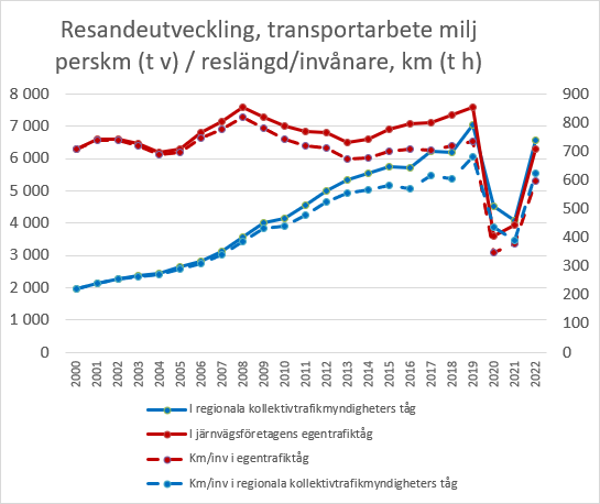 Nyligen kom data från statliga Trafikanalys och SCB som visar att det i första hand är den skattefinansierade regionala tågtrafiken som ökat mest sedan 2000, den kommersiella trafiken som SJ och värsta konkurrenten MTRX kör ligger mer eller mindre still. Värt att notera är att det återstår några snäpp innan man är ikapp siffrorna före pandemin.