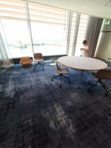 Två trappor upp ligger mötesrummen. Det finns många olika storlekar, allt från styrelserum till större mötesrum. Tekniken är av senaste modell med skärmar som känner av vem som pratar i rummet och fokuserar på vederbörande. Framtidens konferens kommer enligt alla prognoser att bli ett hybridmöte där man träffas på olika platser och knyts ihop av teknik. Det finns även små studios där en ensam vd kan prata till sina anställda via en skärm. Den stora konferenssalen ligger en trappa upp, men vill du visa en nya bil är det bara att rulla in den i den gigantiska hissen och köra upp. Porsche har redan visat en nya elbil här.