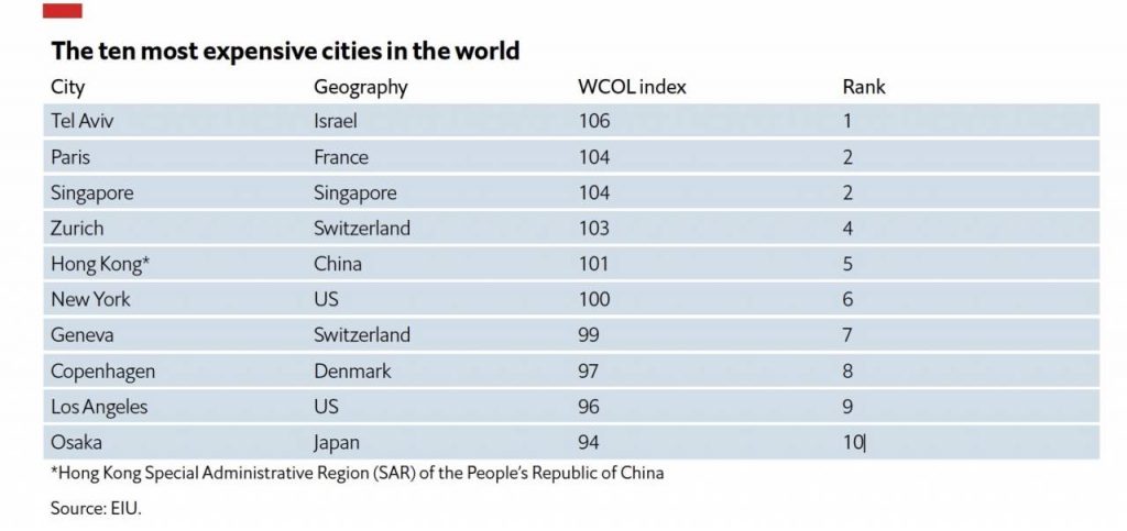 I topp som den dyraste staden att leva i finns Tel Aviv i Israel. Det beror på både en fallande valuta och ökande priser. I förra mätningen kom de på femte plats.