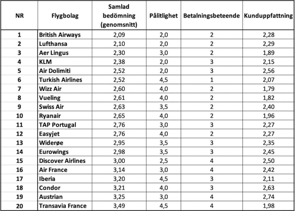 Bedömningen är genomförd mellan 1 december 2023 och 31 maj 2024. Den utgår från tre nyckelfaktorer: mängden förseningar och inställda flyg, viljan att betala ut kompensation och den allmänna kunduppfattningen.