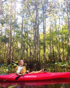 Vi inleder denna dag med att paddla i ett träsk med Tam. Hon har ring i näsan och små tatueringar över hela kroppen. Hon är uppvuxen på en segelbåt och lärde sig simma i en sjö som förstås också innehöll alligatorer. En äkta tuffing med andra ord.