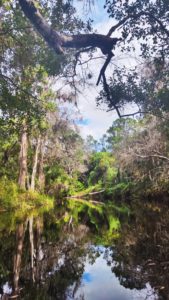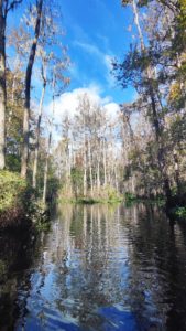 Vi paddlar iväg på ett litet vattendrag genom en sagolikt vacker skog och ja, det dröjer inte länge innan vi ser den lokala alligator-mamman Edith. Hon ligger och solar och hade Tam inte pekat ut Edith hade jag trott att det var en svart trädstam. Hennes man heter George och lär finnas i närheten. Tillsammans har de enligt Tam producerat ett antal ägg som blivit alligatorer som bor längre söderut i det stora träsket.