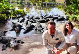 Jag hade tyvärr glömt mina gymnastikskor på hotellrummet så det vara bara min fru som fick åka i en lina över parken. Vi fick vara med och mata alligatorerna med kycklingklubbor och ja, det visade sig att alligatorer är lika människor när det kommer till lättja.