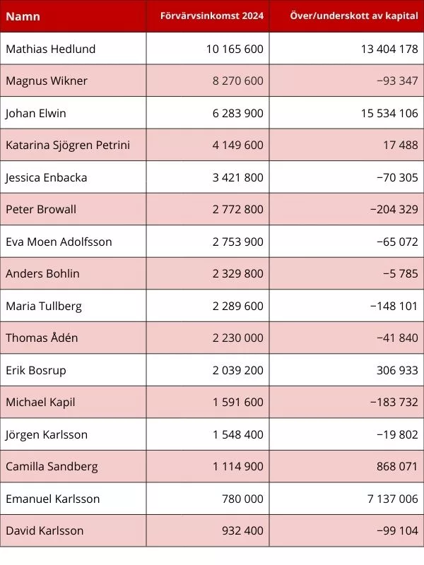 Etravelis vd Mathias Hedlund toppar som vanligt med drygt 10 miljoner i förvärvsinkomst och 13 miljoner i kapitalinkomst. Hans CCO Johan Elwin har en lön en bit över 6 miljoner och mer än 15 miljoner i kapitalinkomst, vilket ger honom tredjeplatsen.